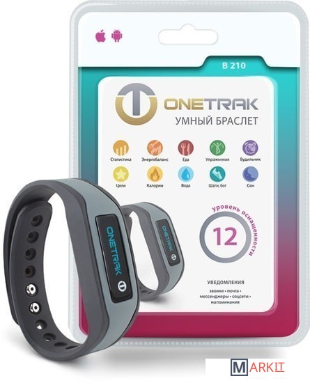 ONETRAK В210 считает шаги и дистанцию, распознает аэробные шаги и бег, определяет расход калорий (в покое/в движении с учётом физических данных). Для максимальной точности расчета сожженных калорий и активности, можно настроить скорость аэробных шагов и бега.С помощью официального приложения ONETRAK можно устанавливать на браслете оповещения, умный будильник, уведомления о звонках и сообщениях, напоминания о необходимости выпить воды, поесть или размяться. Также можно задать цели по количеству воды, шагам, дистанции, энергобалансу и длительности сна. Для контроля питания в приложении собраны данные о калорийности и пищевой ценности 16 млн продуктов и блюд. Внести съеденное в дневник питания можно с помощью сканера штрих-кодов, поиска по названию или меню кафе. Приложение считает потреблённые калории, баланс калорий, соотношение белков, жиров и углеводов. В приложении доступна статистика с детализацией до 2 минут по каждому из параметров, а также дневная и глобальная сводки.Для анализа фаз сна браслет переводится в режим мониторинга сна (автоматически или вручную), в приложении можно посмотреть длительность и эффективность сна, соотношение глубокой, лёгкой фазы сна и активности.Для этой модели доступно веб-приложение, где можно посмотреть статистику друзей и близких и поделиться с ними своими достижениями.