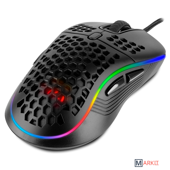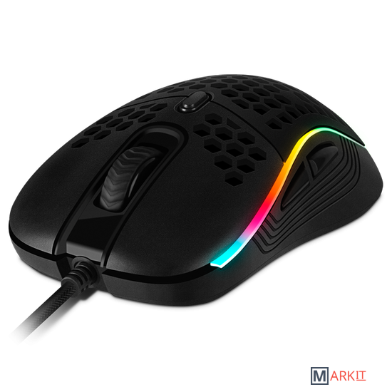Внешний вид тоже достоин внимания: настраиваемая RGB-подсветка поддерживает 16,8 миллиона цветов и делает RX-G860 органичным дополнением внешнего вида игрового пространства. Но даже это еще не все, у подсветки есть замечательная «изюминка» — опция синхронизации со звуком: свечение может меняться в такт музыке или во время воспроизведения звуковых эффектов. Выглядит это просто крайне впечатляюще и позволяет глубже погрузиться в игровой процесс, а иногда — и быстрее среагировать на происходящие события, что особенно важно для киберспортсменов.Технические характеристики не менее интересны, чем дизайнерские решения. Оптическое разрешение регулируется в промежутке от 200 до 12800 DPI — всегда можно подобрать оптимальное значение в зависимости от игровых задач и используемого монитора. Боковые кнопки размещены с двух сторон корпуса, а потому левшам будет удобно пользоваться SVEN RX-G860 не меньше, чем правшам — такая опция встречается у геймерских мышей крайне редко.Две дополнительные кнопки лишними точно не будут, особенно если учесть, что они программируемые и позволяют создавать макросы. При этом настройки хранятся во внутренней памяти устройства, а потому даже при переключении между различными ПК SVEN RX-G860 будет работать привычным для пользователя образом. Не стоит забывать и о том, что геймерские мыши — отличные помощники не только в игре, но и в учебе или работе. Повышенный уровень комфорта использования и дополнительные функции пригодятся и в браузере, и в офисных приложениях, и в редакторах графики или видео.